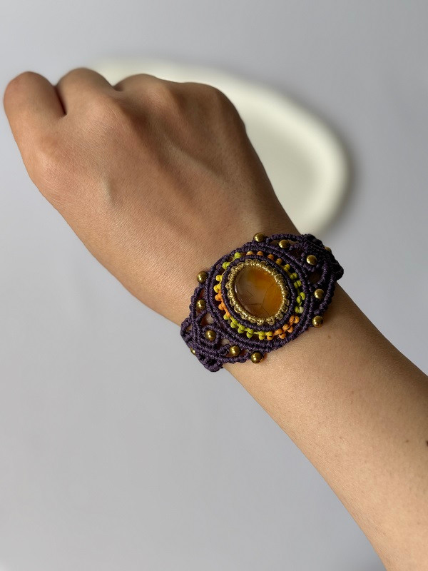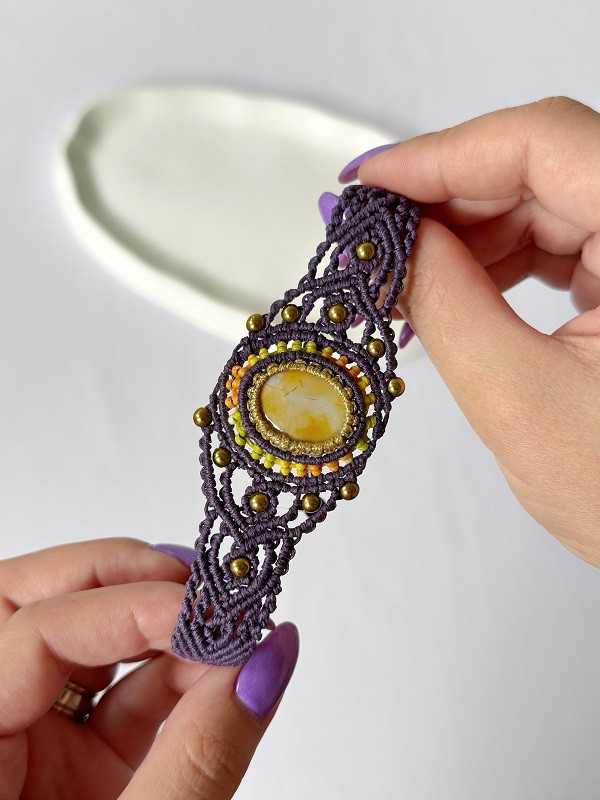 - دستبند مکرومه با سنگ عقیق زرد و مهره حدید